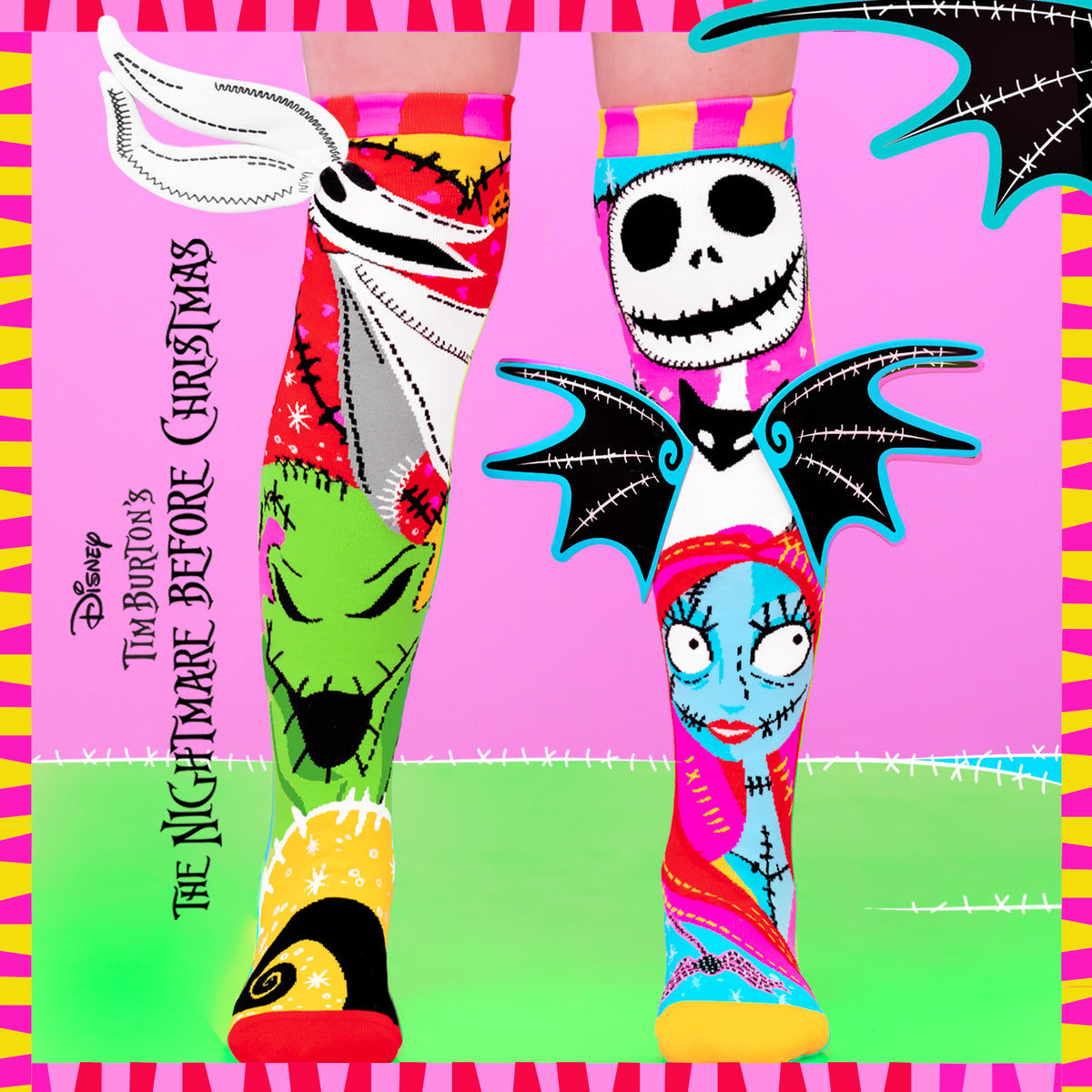 Step into Halloween magic with our Jack Skellington Socks! Featuring Jack, Sally, Oogie Boogie & Zero in vibrant, mismatched designs, plus spooky 3D bat wings and ghost ears for that extra MADMiA twist.